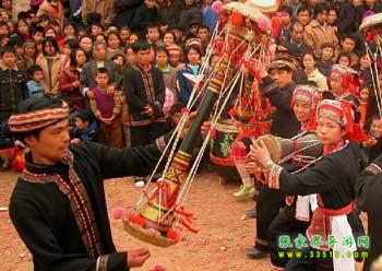 仗鼓舞是白族的一種獨(dú)特舞蹈,尤其是張家界天子山一帶的白族人,大都愛跳仗鼓舞。逢年過節(jié)、游神、趕會(huì),山山寨寨都要舉行歡樂的“跳舞節(jié)”。仗鼓舞根據(jù)人數(shù)多少,分為4人舞、8人舞、32人舞等多種形式,主要道具是仗鼓,鼓長1.2米,兩頭粗,中間細(xì),因兩頭緊繃牛皮,敲擊時(shí)便“嘭嘭”作響。跳舞前須祭祀祖先,然后由三位德高望重的老者先入場(chǎng)引導(dǎo)圍圈歡跳,擺呵、蹬呵、拍呵,繞著場(chǎng)子一圈又一圈地跳,鼓聲陣陣,還有嗩吶、笛子等樂器伴奏,舞姿靈活多變,古樸大方,驚險(xiǎn)敏捷,民族色彩濃郁。